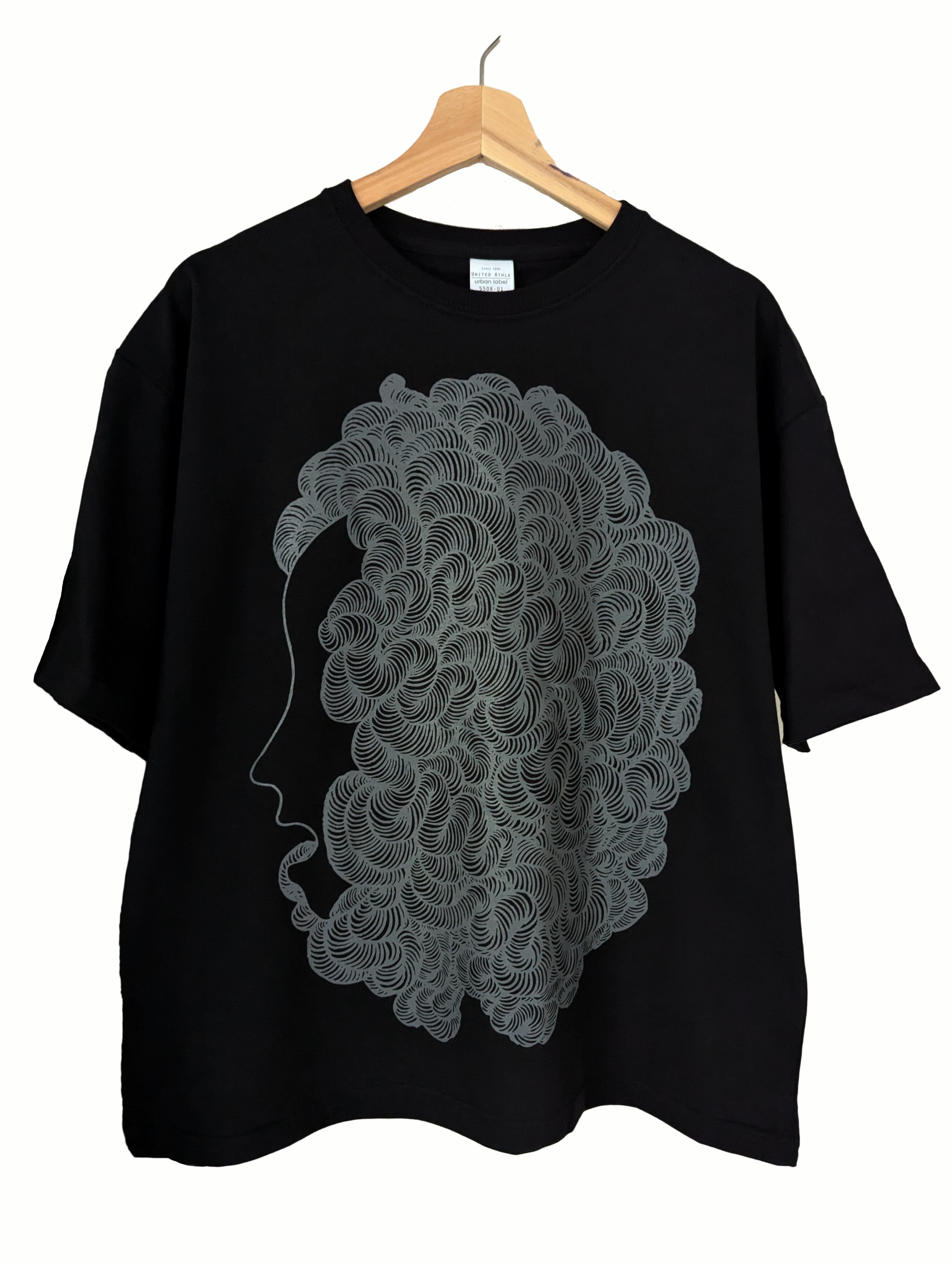 うねるようなラインとフェイスのモチーフを、シルクスクリーンで一枚ずつ手刷り。